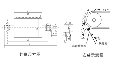 | 型號(hào) | 筒表磁場(chǎng)強(qiáng)度Gs | 皮帶速度≤m/s | 物料厚度≤mm | 重量kg | 外形尺寸mm | ||||||||